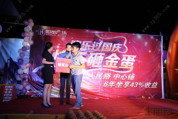 为了欢庆即将到来的65周年华诞,恒基广场9月30日晚8点在售楼部门前举行了“欢乐过国庆,快乐砸金蛋”的活动,现场准备了65个金蛋,***中奖,活动吸引了众多市民的积极参与。