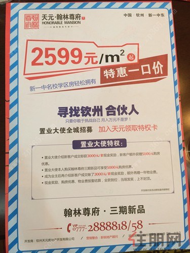 天元翰林尊府项目前两期2013年完美售罄,目前三期准现房房源大钜惠,在售 28#,29#,30#,31#,主推85-126㎡两房三房户型。特惠价2599元/平米起,0首付!0月供!0利息!抢购新一中名校**房,目前置业大使全城招募!推荐成交即获3000元现金奖励,新客户额外优惠5000元。